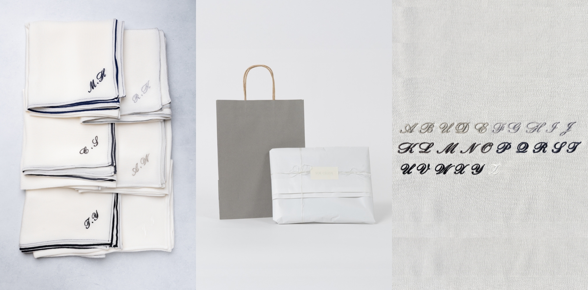 SOIE CÉLESTEでは、イニシャル刺繍をお入れするカスタマイズサービスを承っております。